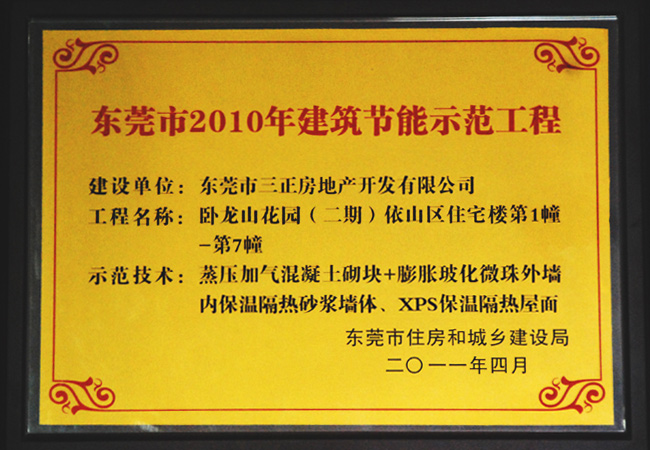 三正地產(chǎn)積極相應國家政策,在商品房物業(yè)的打造上,嚴把規(guī)劃設計與工程施工關,結合國家對房地產(chǎn)設計行業(yè)規(guī)劃、設計方面新的要求,推進建筑環(huán)保節(jié)能,并取得了不俗的成績。其中,三正臥龍山依山居1~7幢因采用蒸壓加氣混凝土砌塊+膨脹玻化微珠外墻、內保溫隔熱砂漿墻體、XPS保溫隔熱屋面等新型環(huán)保節(jié)能材料,被評為“東莞市2010年建筑節(jié)能示范工程”,獲得政府表彰與嘉獎。
