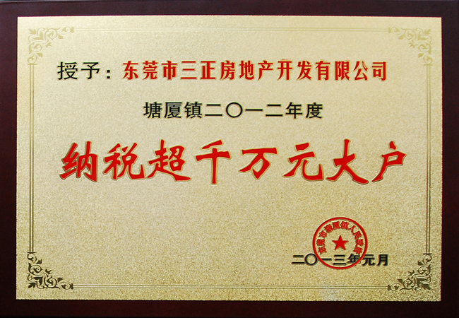 2012年,憑借著半山豪苑第四期項目——水岸豪庭的熱賣,繳納各種稅收超千萬元。在此次表彰會上,三正地產(chǎn)獲評“納稅超千萬元大戶”。
